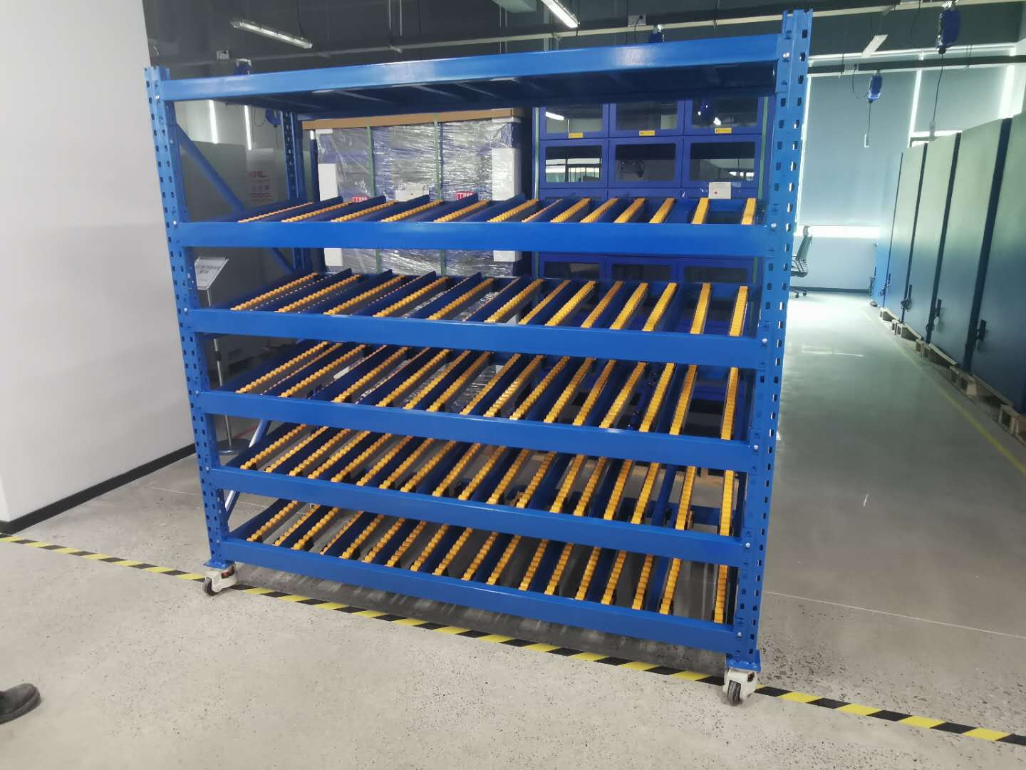 上圖是根據客戶要求貨架規格L1900*W750*H1800 不含腳輪 數量 5套  貨架層數:5層流利+頂層鋪板 貨架每層配18條流利條,配10塊導向板 單層承重300KG/層貨架頂層配0.6mm鋼層板,承重100KG/層 貨架一共可放置1600KG貨物,導向板高度65mm 流利條為鋁合金,黃色膠輪 流利條輪距30mm 總高41mm 腳輪采用4寸福馬輪 流利條角度為3度 貨架每層可按50mm倍數上下調節層高.