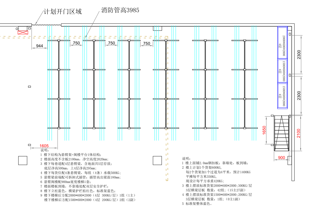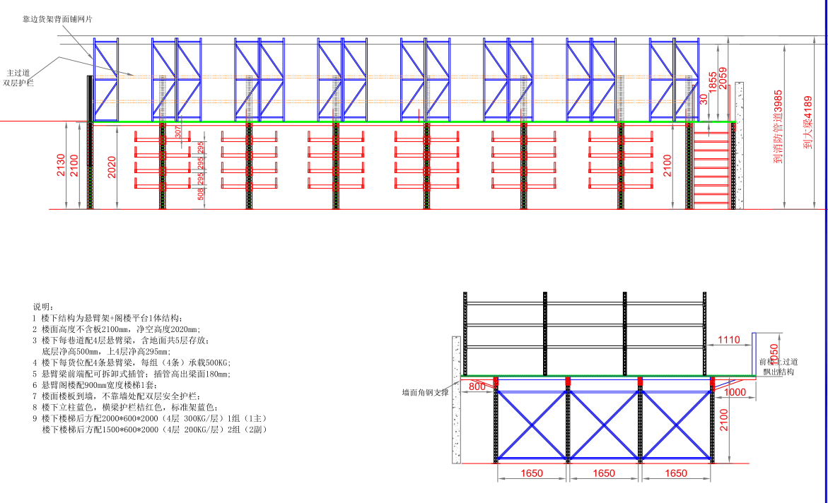 1、樓下結(jié)構(gòu)為懸臂貨架+閣樓平臺(tái)一體結(jié)構(gòu)