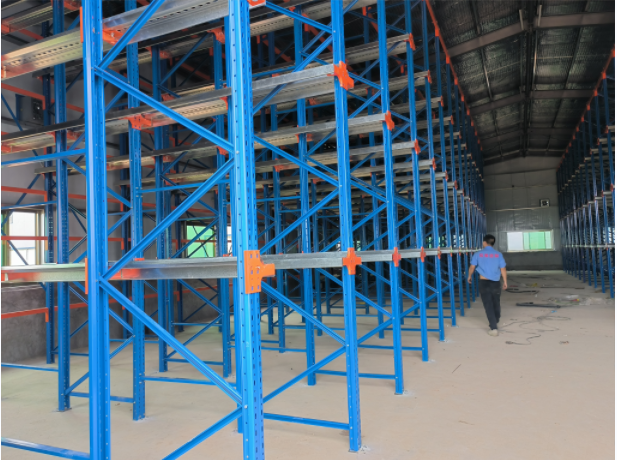 首先依據客戶倉庫的高度規劃貫通式貨架,貨架高度達到了庫房的全高,這樣可以做成了4層貨架,把貨物放置在托盤上,可直接運用叉車進出貨品。在貫通式貨架上會安裝上導軌,可降低了貨物和貨架的損壞率。